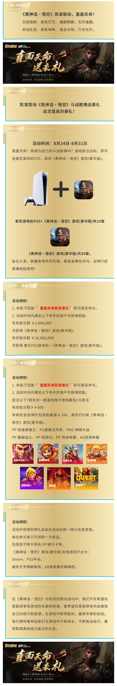 凯发联动《黑神话·悟空》斗战胜佛送豪礼,这次是真的豪礼!直面天命!想成为自己的斗战胜佛吗?游戏投注或存款达标,即可送索尼游戏机PS5,游戏《黑神话·悟空》游戏(豪华版)。