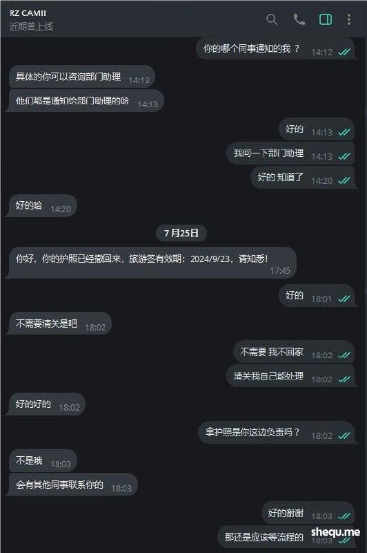 7月19日公司RZ部门 RZCAMII同事联系我说收到了离职申请,目前我的护照办理9G中离职了要把我的9G撤回 我问什么时间送过去办理回复我4月份, 说7月初同事通知我去按指纹 而我接到消息都7月11日了