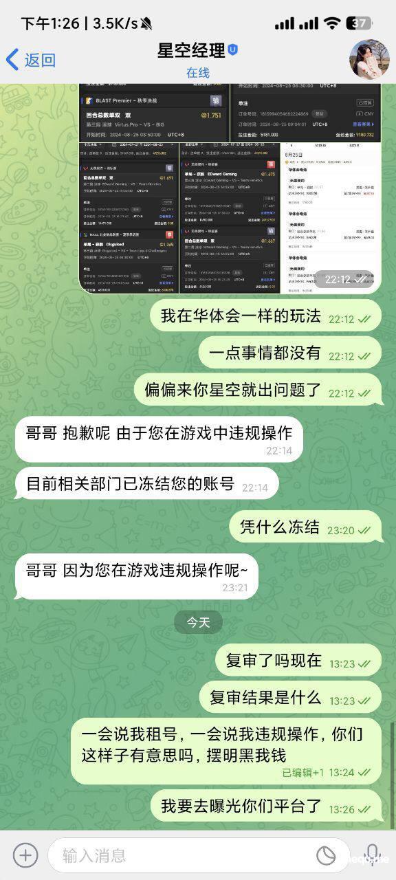 我在华体会开云爱游戏平台输了几百万都是这种玩法,等级vip8以上都有3个号,我想说明的是我正常玩,你黑我款?现在bob的格局就这点了?如果平台不处理此事,我会继续曝光,维护我自己的权利,我会用我的能力去举报这骗子平台。希望领导自己联系我,星空的维护就是机器人。没办法交流。